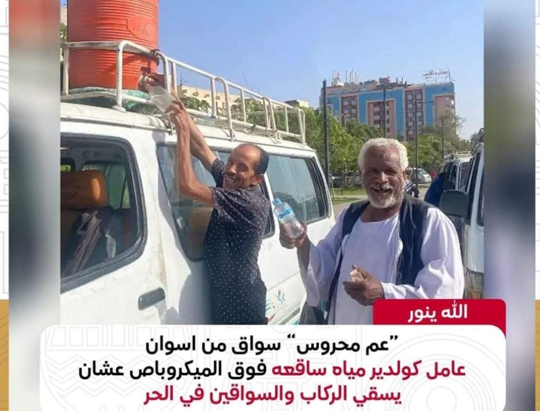 جبر الخواطر على الله …أسوان وناسها الطيبين أسوان وأهلها أصحاب الشهامة والجدعنه والرجولة والكرم والجود شوف “عم محروس” عامل ايه قام بتنفيذ كولدير مياه برده عشان يسقى عطش الركاب وكمان أصحابه السائقين…