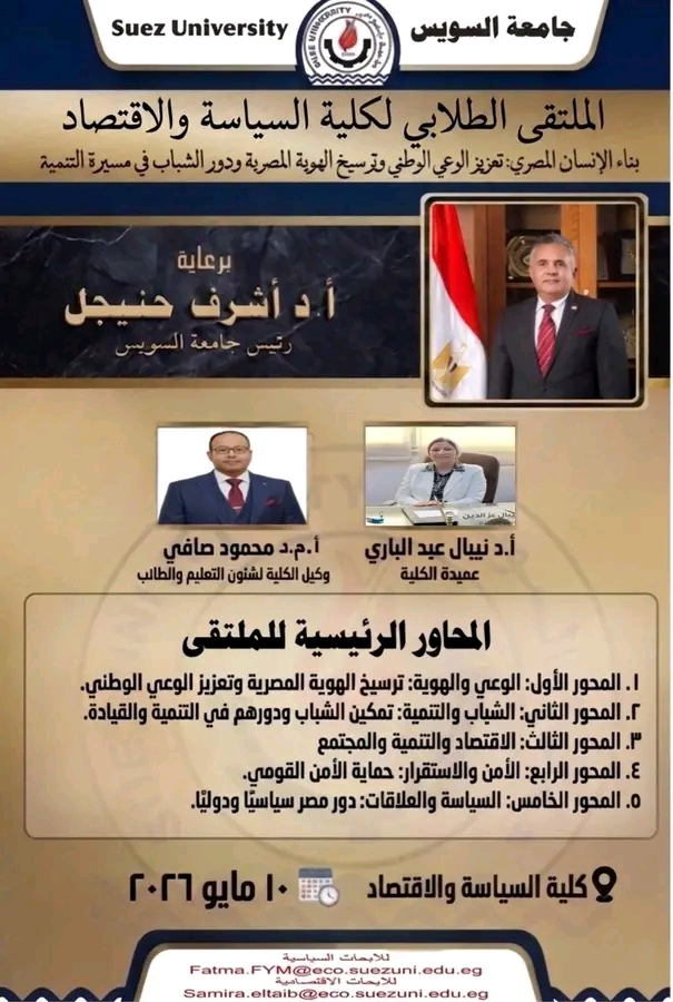 تعلن كلية السياسة والاقتصاد عن تنظيم «الملتقى العلمي الطلابي» الذي يقام تحت عنوان «بناء الإنسان المصري: تعزيز الوعي الوطني وترسيخ الهوية المصرية ودور الشباب في مسيرة التنمية» وذلك يوم الأحد الموافق ١٠ مايو 2026.