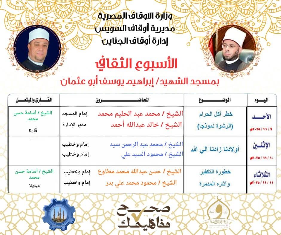 انطلاق الأسبوع الثقافي بأوقاف السويس غدًا من مسجد الشهيد إبراهيم يوسف أبو عثمان التابع لإدارة أوقاف الجناين