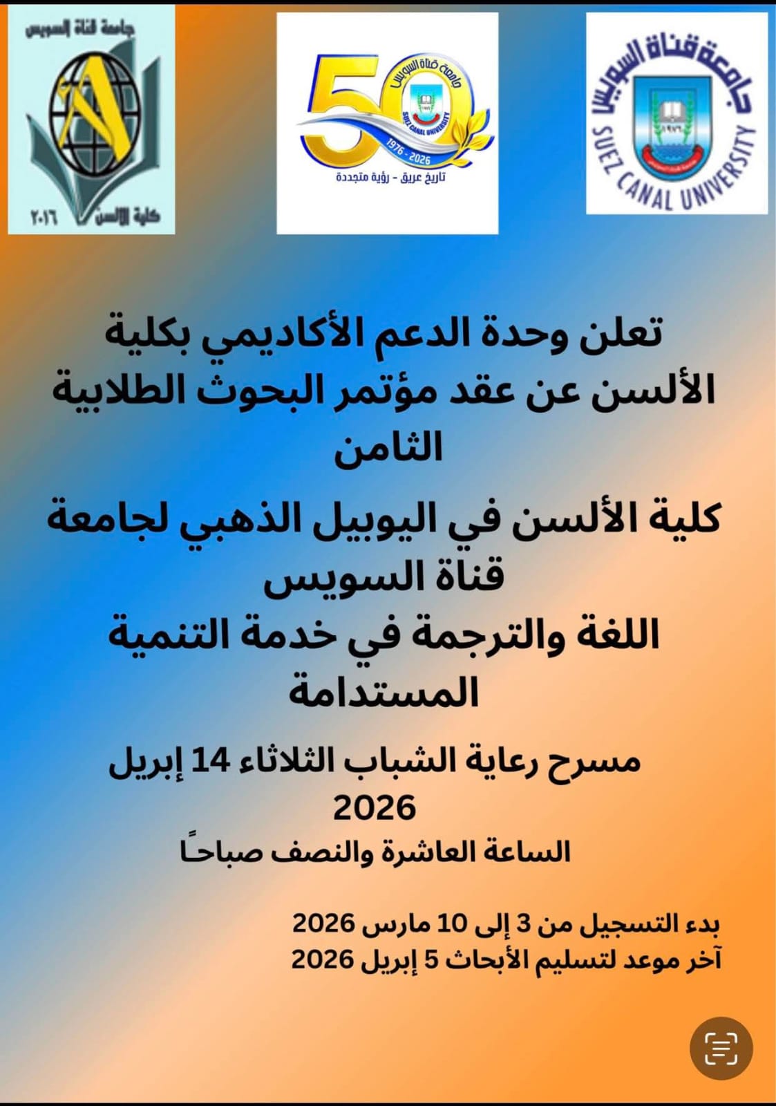 في إطار دعم البحث العلمي الطلابي وتعزيز دور اللغة والترجمة في خدمة قضايا التنمية، وتحت رعاية الدكتور ناصر مندور رئيس جامعة قناة السويس، وبإشراف عام الدكتور محمد عبدالنعيم نائب رئيس الجامعة لشئون التعليم والطلاب والمشرف على كلية الألسن، أعلنت وحدة الدعم الأكاديمي بكلية الألسن عن انطلاق المؤتمر الثامن للبحوث الطلابية بكلية الألسن يوم الثلاثاء الموافق 14 إبريل 2026، تحت عنوان: “كلية الألسن في اليوبيل الذهبي لجامعة قناة السويس.. اللغة والترجمة في خدمة التنمية المستدامة”.
