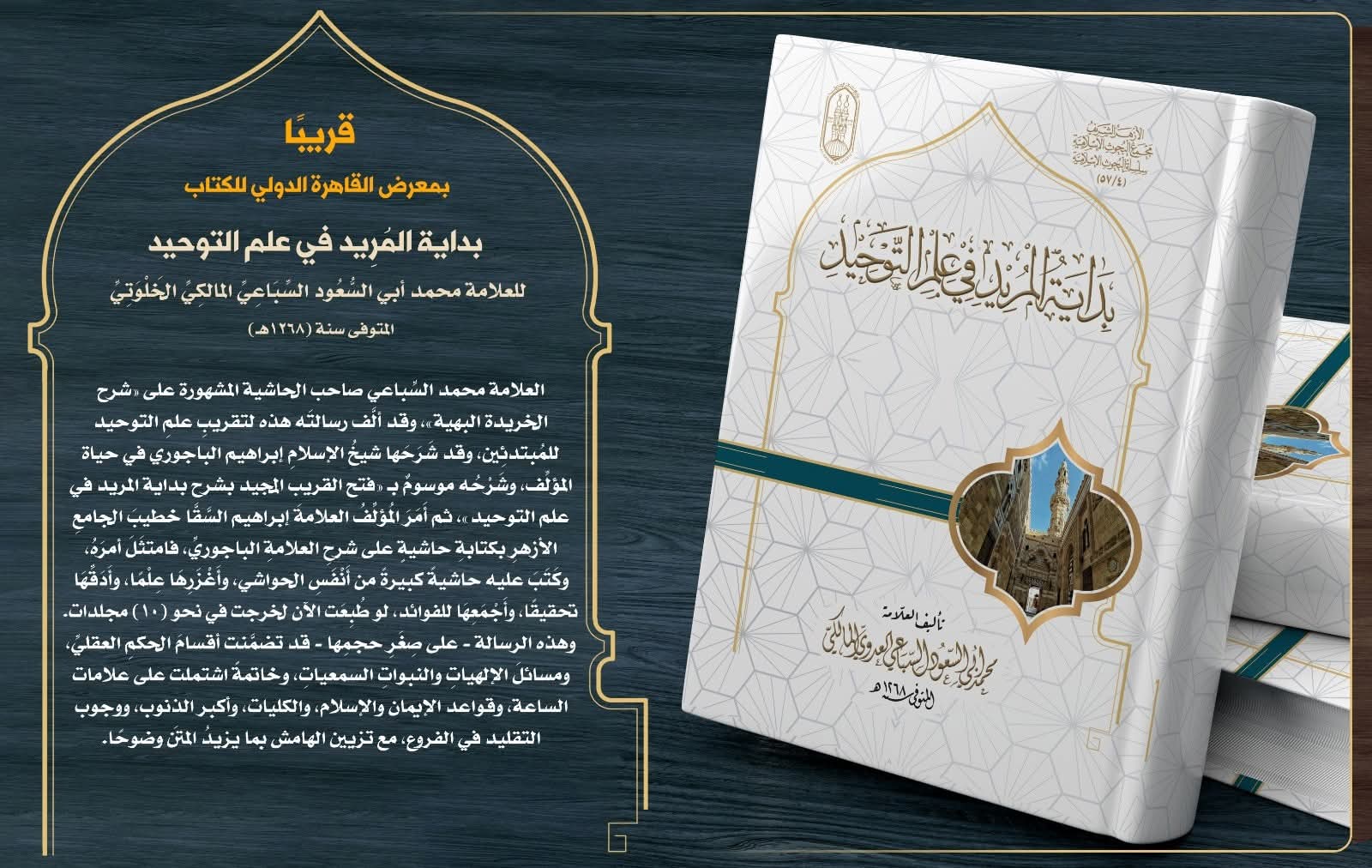 يقدِّم جناح الأزهر الشريف بمعرض القاهرة الدولي للكتاب، في دورته الـ 57، لزوَّاره كتاب “بداية المُرِيد في علم التوحيد”، للعلامة محمد أبي السُّعُود السِّبَاعِيِّ المالكِيِّ الخَلْوَتِيِّ، المتوفى سنة (1268هـ)، صاحب الحاشية المشهورة على «شرح الخريدة البهية»، من إصدارات مجمع البحوث الإسلامية بالأزهر الشريف .