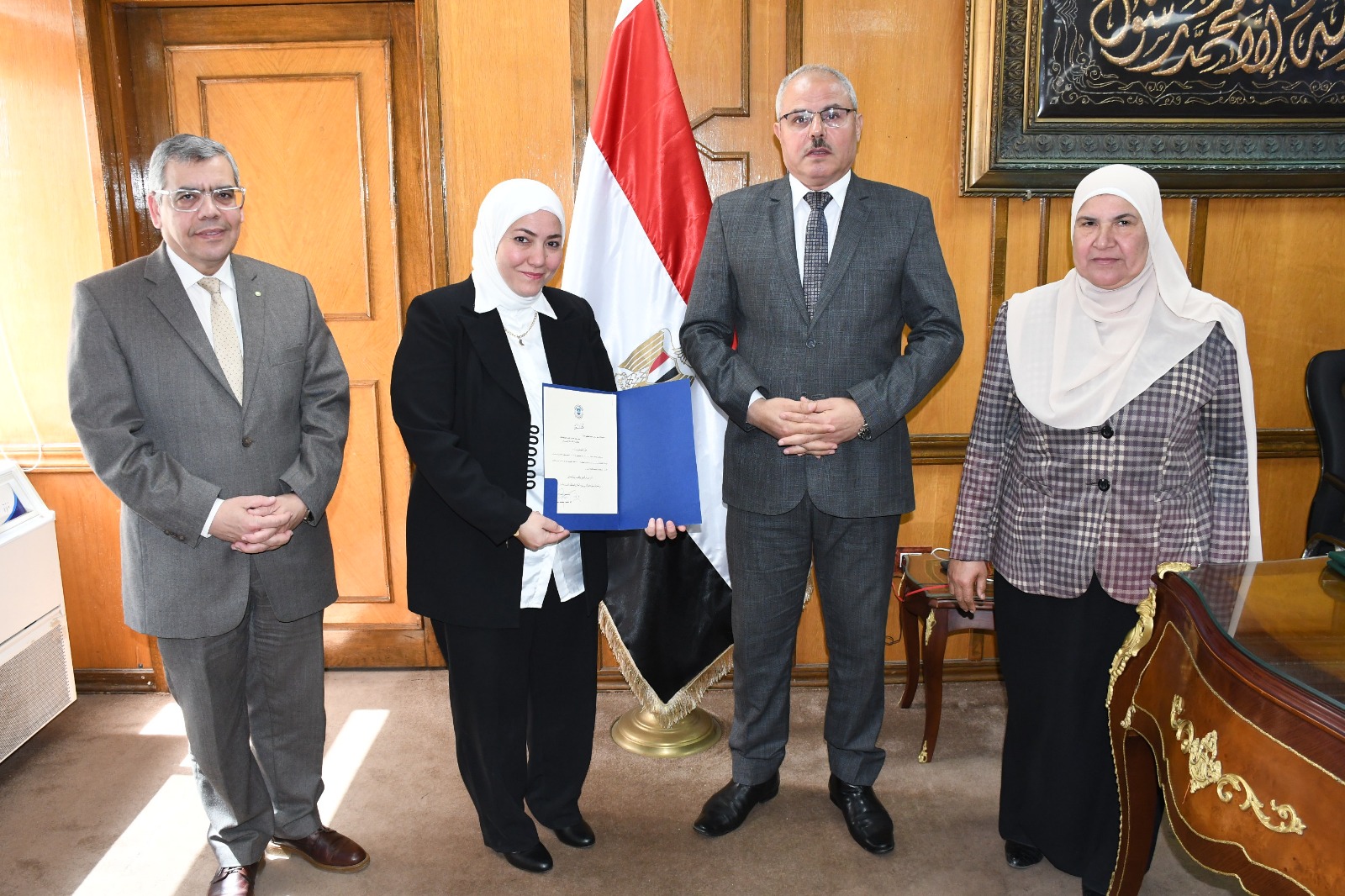 حضر مراسم تسليم القرار الدكتور محمد سعد زغلول نائب رئيس الجامعة لشئون الدراسات العليا والبحوث، والدكتورة سهير أبو عيشه أمين عام الجامعة.