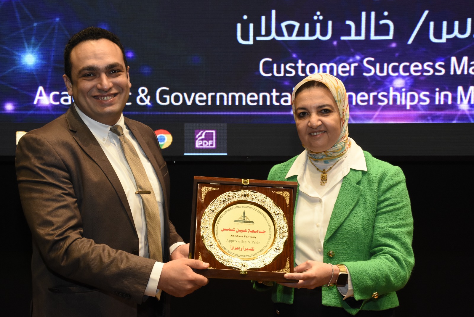 وقامت الأستاذة الدكتورة أماني أسامة كامل بتكريم كلٍ من الدكتور محمد أمير والمهندس خالد شعلان، بإهدائهما درع الجامعة، تقديرًا لجهودهما .