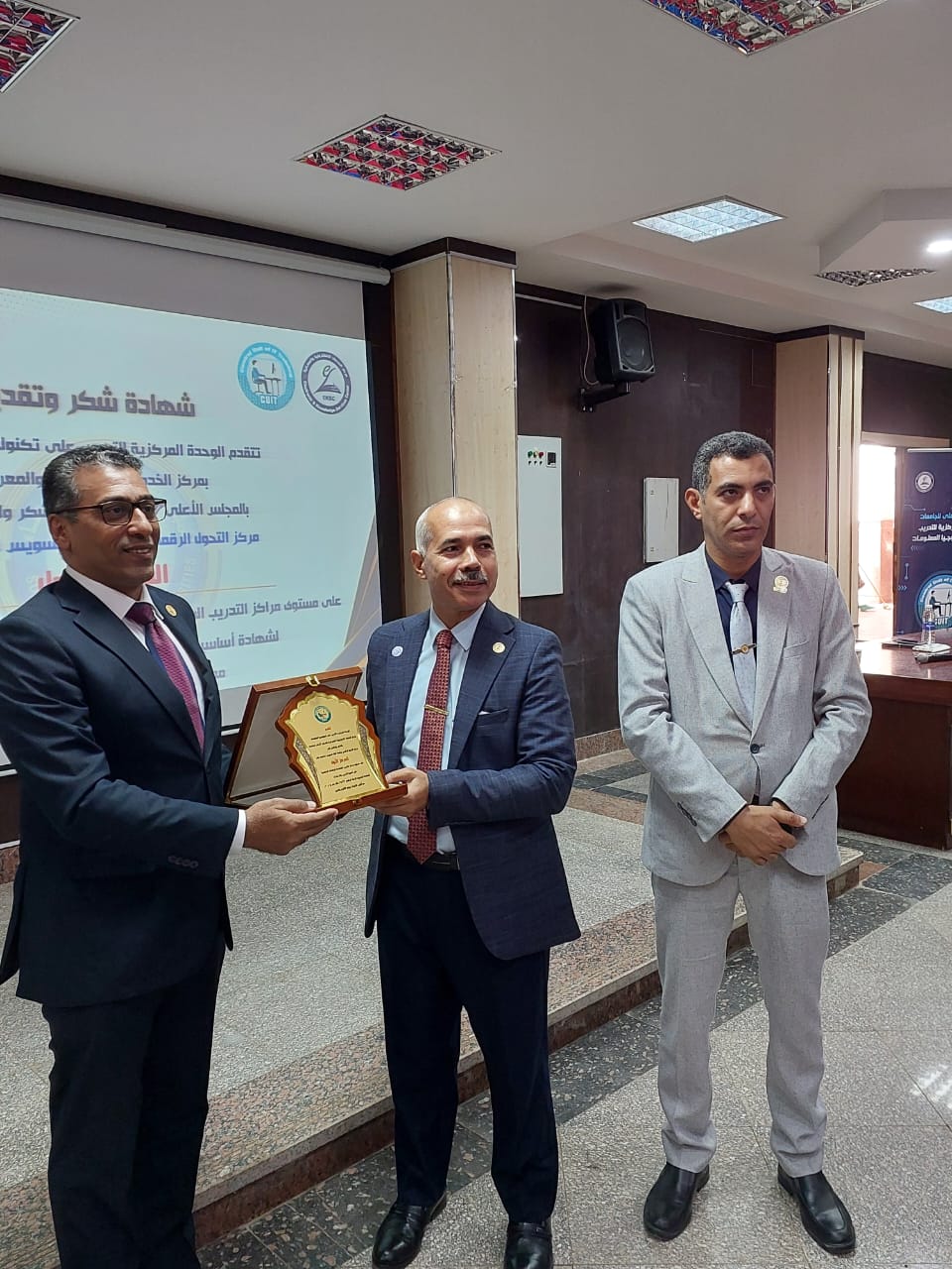 وأوضح رئيس الجامعة أن هذا الإنجاز جاء بعد تقييم شامل لأداء مراكز التدريب، حيث تسلّم الدكتور تامر شوقي، مدير مركز التحول الرقمي بالجامعة، درع التميز الممنوح من الوحدة المركزية للتدريب بـالمجلس الأعلى للجامعات، من خلال الوحدة المركزية للتدريب على تكنولوجيا المعلومات CUIT.