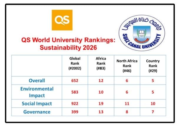 جامعة قناة السويس تحصد تقدماً استثنائياً في تصنيف كيو إس للاستدامة 2026 وتؤكد ريادتها الأكاديمية والبحثية