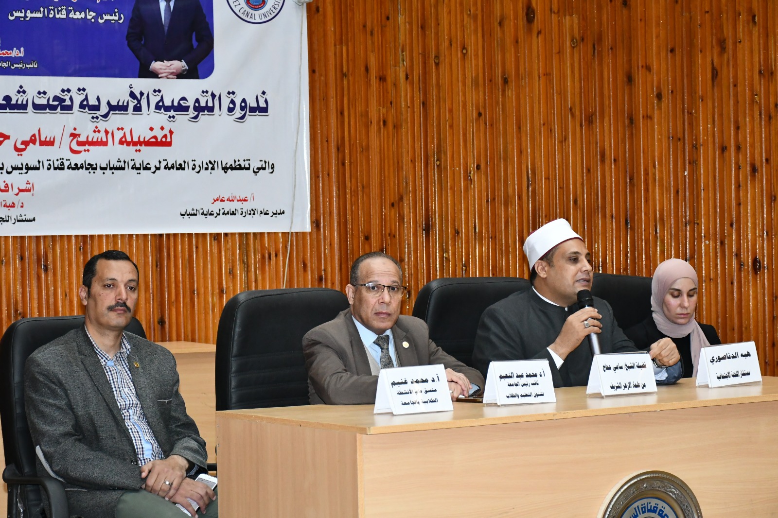 نظمت الإدارة العامة لرعاية الشباب بجامعة قناة السويس، بالتعاون مع الإدارة المركزية لتنمية الشباب بوزارة الشباب والرياضة ندوة التوعية الأسرية تحت شعار “أسرة مستقرة = مجتمع آمن”، لفضيلة الشيخ سامي حجاج من علماء الأزهر الشريف.