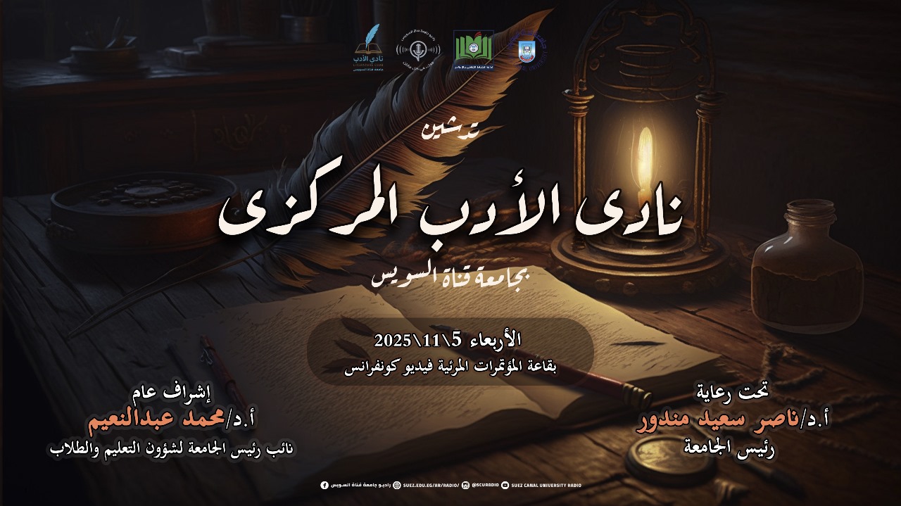 تحت رعاية الدكتور ناصر مندور، رئيس جامعة قناة السويس، وبإشراف عام من الدكتور محمد عبد النعيم، نائب رئيس الجامعة لشئون التعليم والطلاب، وبإشراف تنفيذي من الدكتور أحمد كمال، منسق عام الأنشطة الطلابية، والدكتورة ندى محمد كمال، مستشار لجنة النشاط الثقافي والإعلامي، وبالتنسيق مع الإدارة العامة لرعاية الشباب بإشراف الأستاذ عبد الله عامر، مدير عام الإدارة العامة لرعاية الشباب، والأستاذة مروة عدلي، مدير إدارة النشاط الفني، تُدشّن جامعة قناة السويس نادي الأدب المركزي في مبادرة متميزة لإحياء روح الإبداع الأدبي بين طلابها وصقل مواهبهم الأدبية والفكرية.