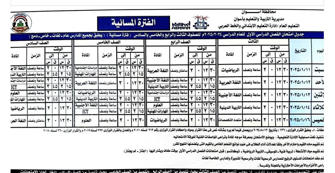 جدول امتحانات الترم الاول من العام الدراسي 2025 للصفوف المرحلة الابتدائية بمحافظة أسوان
