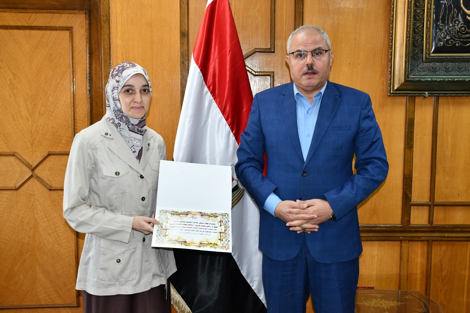 رئيس جامعة قناة السويس يُكرم الدكتورة داليا صبري الفائزة بجائزة الأبحاث العلمية المُوجهة لخدمة المجتمع لغير أعضاء هيئة التدريس لعام 2023-2024