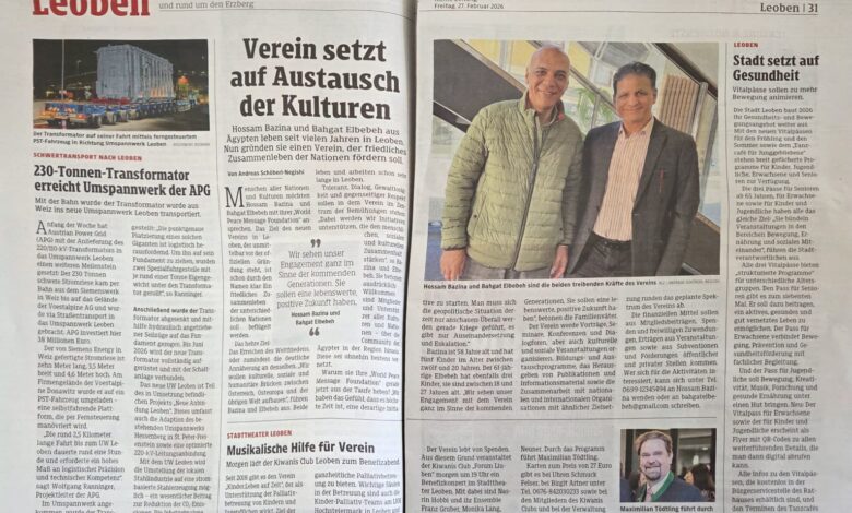 أفردت صحيفة “كلاينه تسايتونج” (Kleine Zeitung) النمساوية واسعة الانتشار في عددها الصادر اليوم الجمعة 27 فبراير 2026، مساحة واسعة لتغطية خبر تأسيس مكتب “مؤسسة رسالة السلام العالمية” (World Peace Message Foundation) في مدينة ليوبن النمساوية، وهي مبادرة طموحة يعمل على نشرها مكتب مؤسسة رسالة السلام العالمية في النمسا ودول شرق أوروبا بقيادة بهجت العبيدي ومشاركة فاعلة للمهندس حسام بازينة المقيمان في المدينة منذ سنوات طويلة.
