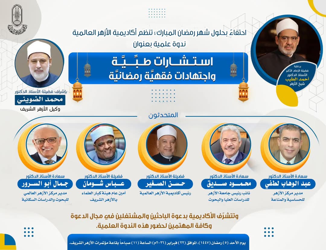 تنظم أكاديمية الأزهر العالمية لتدريب الأئمة والوعاظ ندوة علمية بعنوان: «استشارات طبية واجتهادات فقهية رمضانية» بأكاديمية الأزهر العالمية، غدا الأحد الموافق ٥ رمضان، 22 فبراير، بمركز المؤتمرات بمدينة نصر، في تمام الساعة الحادية عشر صباحا .