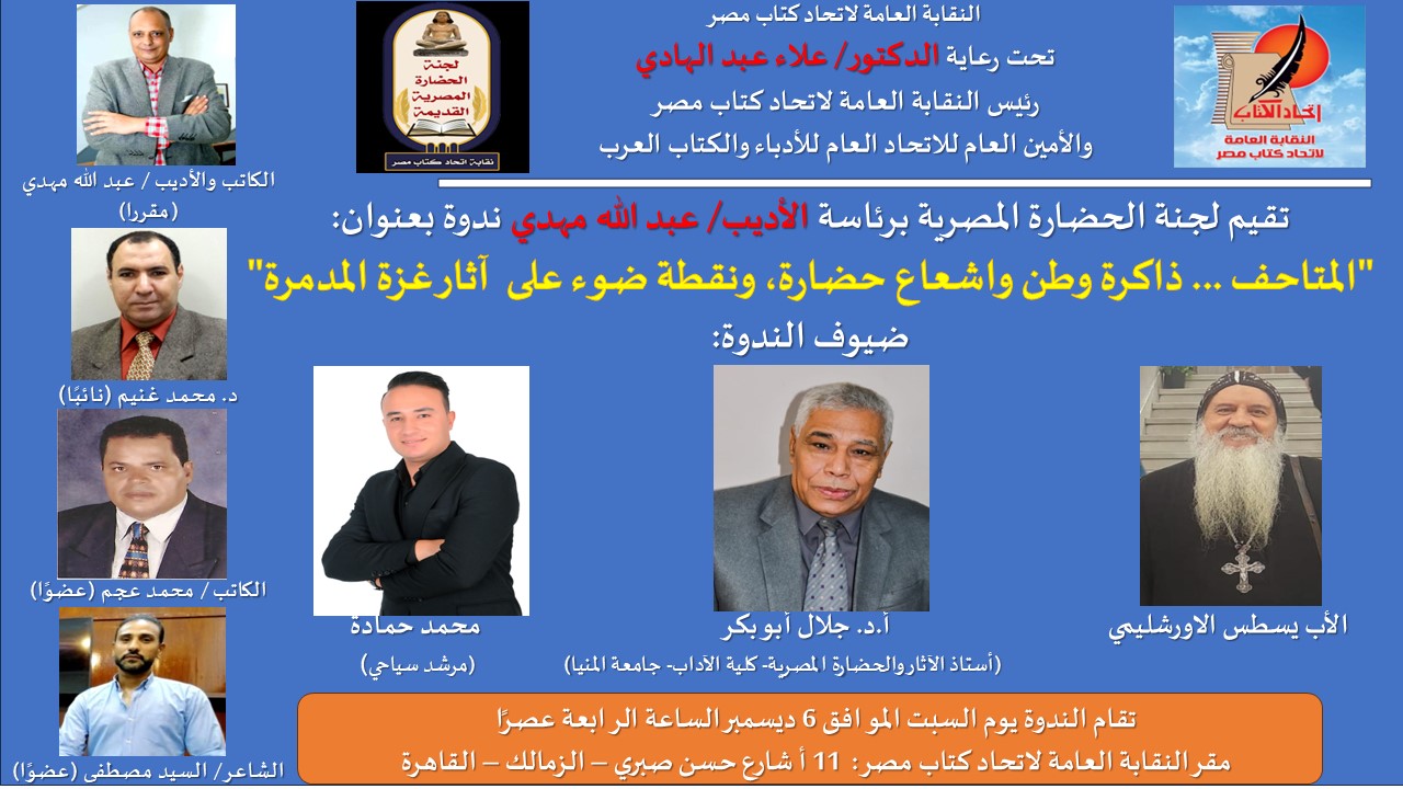في ندوة باتحاد كتاب مصر: المتاحف .. ذاكرة وطن وإشعاع حضارة ... ونقطة ضوء على ٱثار غزة المدمرة