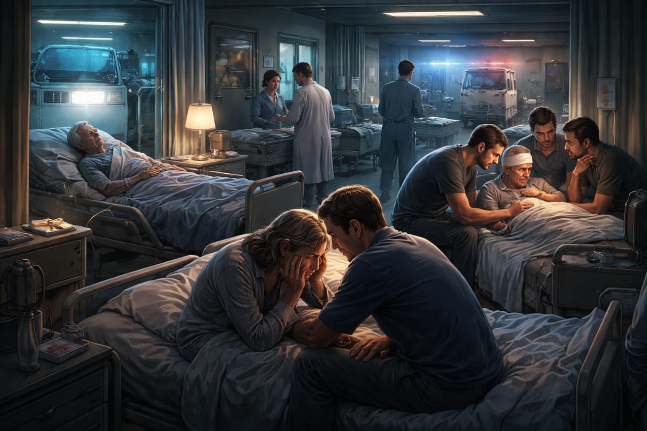 مرّت الساعات… تحسّن الرجل… أما المرأة المسنّة… فأغمضت عينيها بهدوء… لم يكن المرض وحده مؤلمًا… بل الوحدة أيضًا.