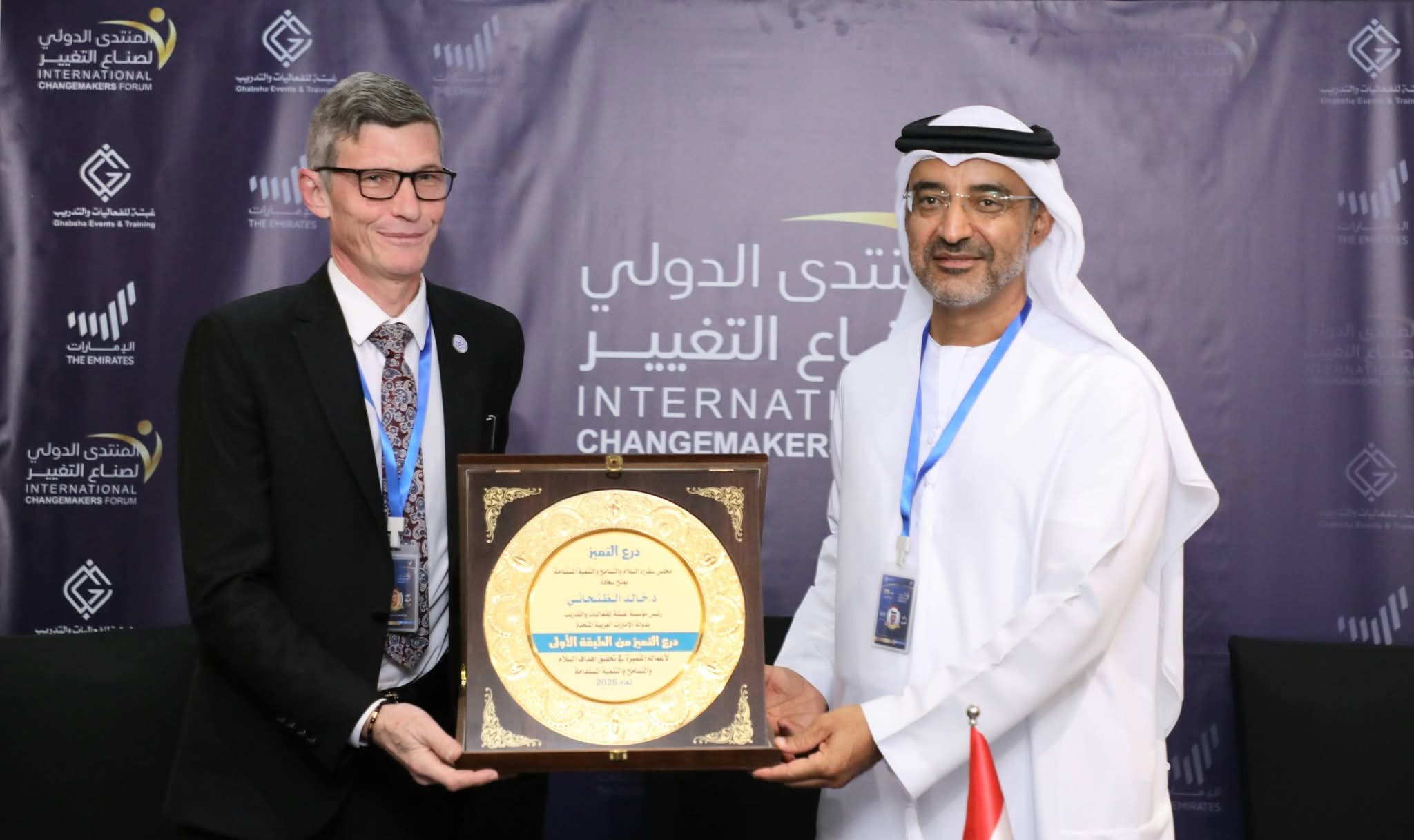 تسلّم الظنحاني التكريم من الدكتور محمود شعبان رئيس مجلس سفراء السلام والتسامح والتنمية المستدامة بالمملكة المتحدة، وذلك على هامش فعاليات المنتدى الدولي لصنّاع التغيير 2025 في دبي.