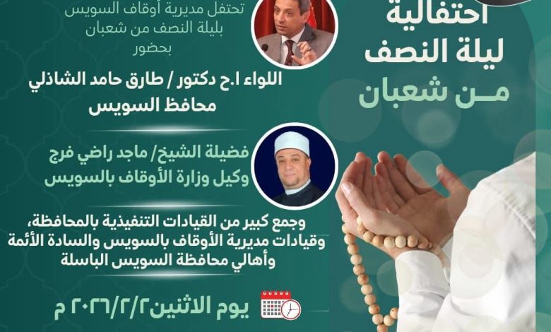 ​تحت رعاية الأستاذ الدكتور أسامة الأزهري، وزير الأوقاف، وفي إطار احتفالات الدولة بالليالي المباركة، تشهد محافظة السويس يوم الاثنين، الموافق 2 فبراير 2026، الاحتفالية الكبرى بليلة النصف من شعبان.