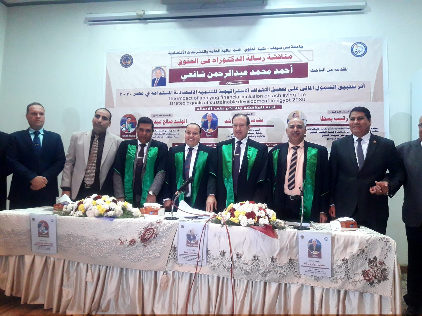 منحت كلية الحقوق بجامعة بني سويف الباحث أحمد محمد عبدالرحمن شافعي درجة الدكتوراه بقسم المالية العامة والتشريعات الاقتصادية بتقدير جيدا جدا مع مرتبة الشرف عن رسالته بعنوان ” أثر تطبيق الشمول المالي علي تحقيق الأهداف الاستراتيجية للتنمية الاقتصادية المستدامة في مصر ٢٠٣٠ .