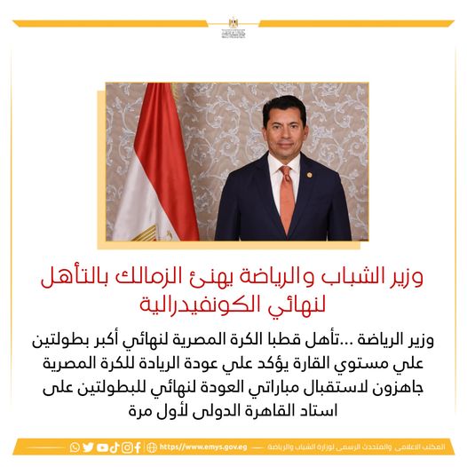 وزير الشباب والرياضة يهنئ الزمالك بالتأهل لنهائي الكونفيدرالية