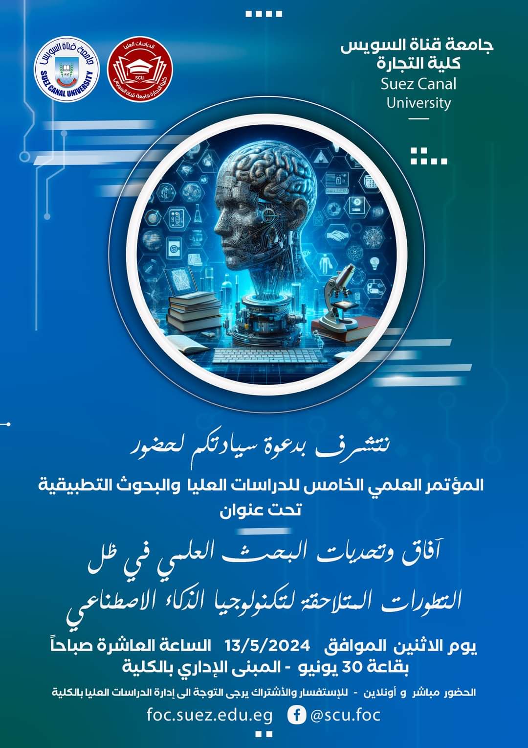تحت رعاية الدكتور ناصر مندور رئيس جامعة قناة السويس.تنظم كلية التجارة جامعة قناة السويس مؤتمرها العلمي الخامس للدراسات العليا والبحث التطبيقية تحت عنوان : ” آفاق وتحديات البحث العلمي في ظل التطورات المتلاحقة لتكنولوجيا الذكاء الاصطناعي”.