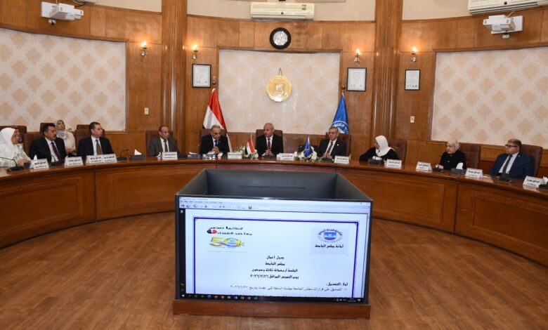 ووجّه المحافظ كلمة إلى السادة نواب رئيس الجامعة وعمداء الكليات وأعضاء مجلس الجامعة، معربًا عن سعادته بالتواجد في هذا الصرح العلمي العريق الذي يمثل أحد أهم منارات العلم والمعرفة، ويُعد شريكًا أصيلًا في مسيرة التنمية الشاملة التي تشهدها المحافظة في مختلف القطاعات.